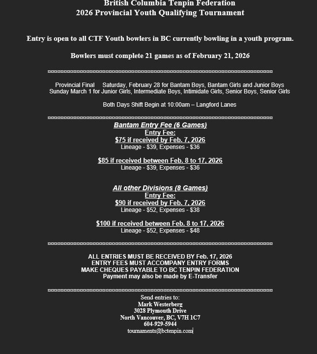 Please click the entry form link below to download the entry form for the tournament. Deadline to enter the tournament is February 7, 2026. Entry form and payment can be sent to tournaments@bctenpin.com